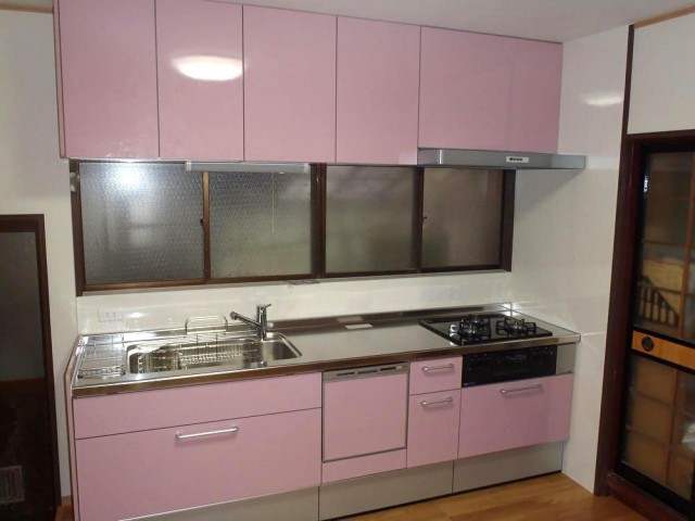 ツヤのあるかわいいピンク色のキッチンが、パッと華やかな雰囲気です(#^^#)
